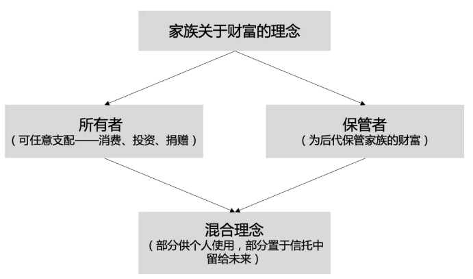 保管者理念。一 些家族成员则倾向于家族应该有共同的财富或者共同的企业,认为从前辈继承来的财富无论是谁在管理,都属于家族共同财富,管理者不是所有人而是保管者,有责任为家族管理好这些财富。因此,他们对遗产、责任、风险、投资、消费、下一代教育都持与所有者不同的态度。
