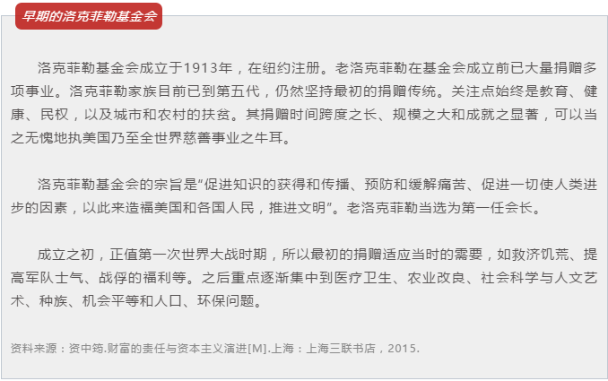 从家族慈善的运作模式看,传统的模式主要有捐赠型和运作型两种。早期的家族慈善多是单纯的捐赠型,慈善目的由慈善机构实施,家族慈善基金只负责向慈善机构拨款。早期的洛克菲勒基金会可以说是捐赠型运作模式的典型。