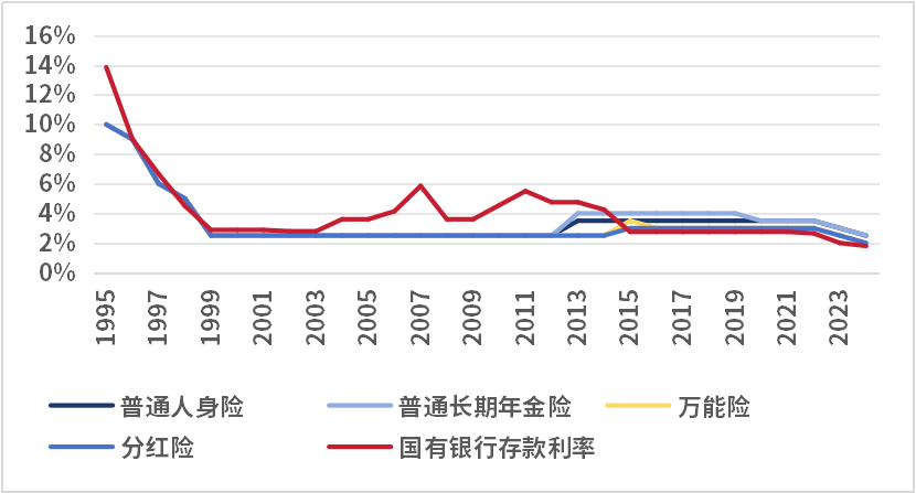 由于寿险利率具有长期性和刚性特征,一般跨越十几年甚至几十年都不会改变,负债端存量业务高预定利率的高额支出,加上资产端在《保险法》(1995年)发布后,保险资金投资被限定在银行存款、国债、金融债、少数企业债等有限的资产类别上,这些资产收益率在降息后逐渐下行,收益不足以覆盖支出导致寿险行业面临巨大的利差损,特别是那些持有高预定利率存量业务的保险公司。为了消化存量业务带来业绩压力,在此后的14年间,寿险产品预定利率被严格控制在2.5%的水平。2013年虽然有所提升,但是2019年8月保险监管部门再次规定年金保险的预定利率不得高于3.5%。